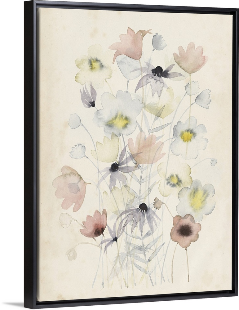 <p>A delicate watercolor painting of a faint flower bouquet in yellow, blue and red tones on a beige backdrop.</p>