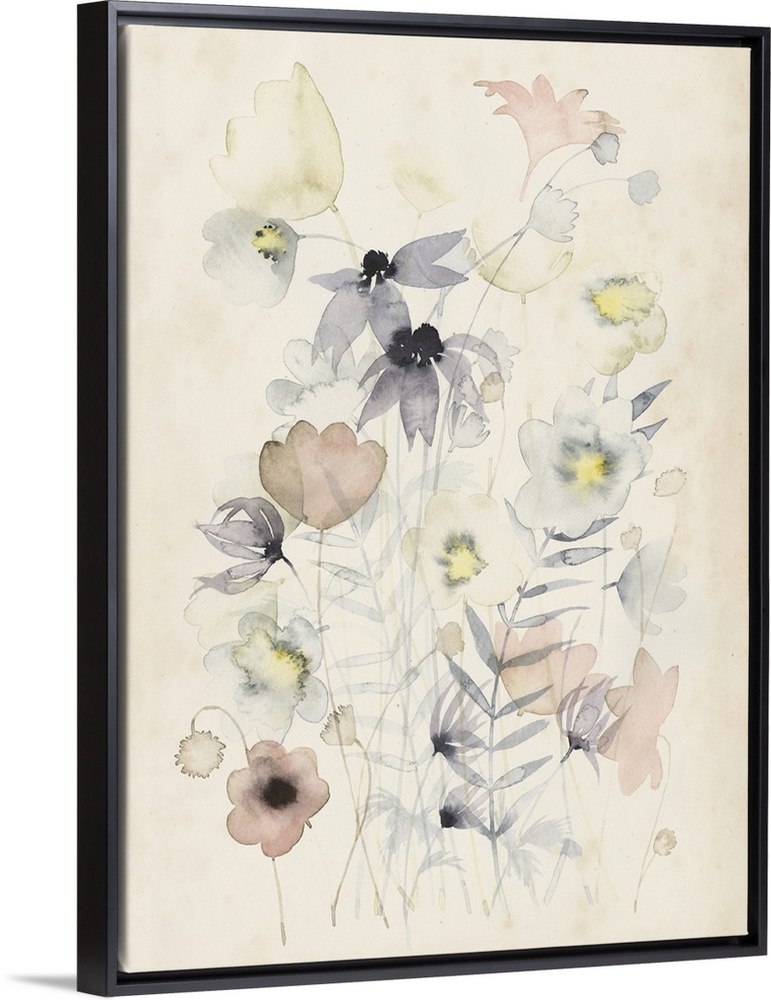 <p>A delicate watercolor painting of a faint flower bouquet in yellow, blue and red tones on a beige backdrop.</p>