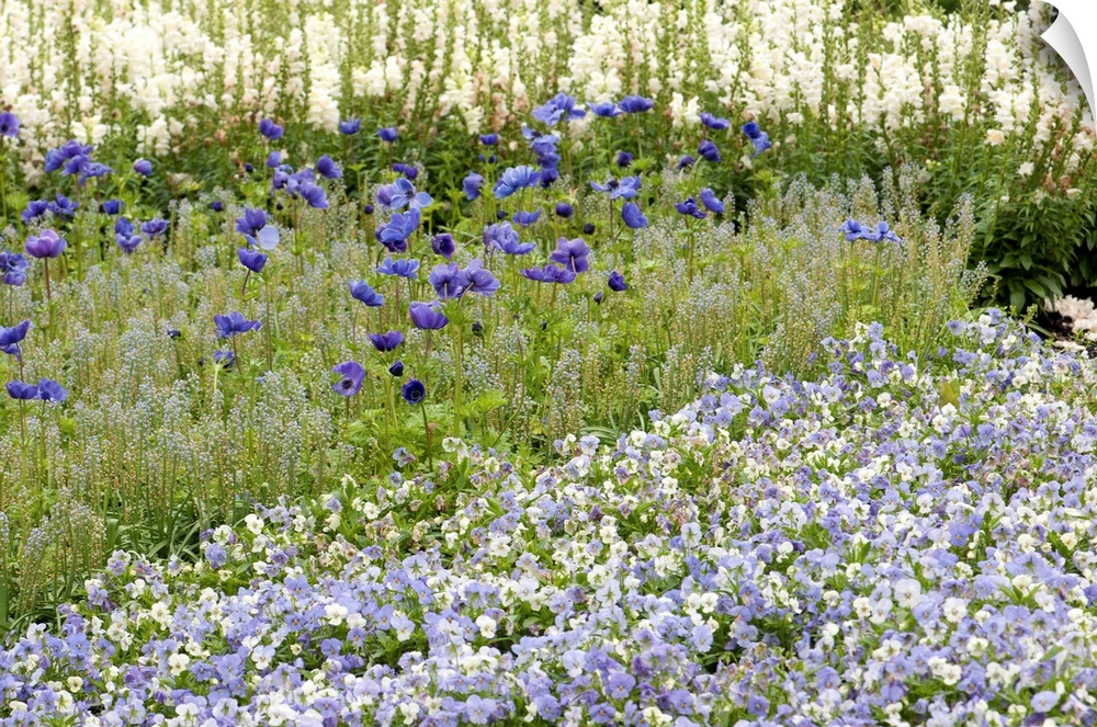 <p>Garden with purple and white flowers including anemones and pansies.</p>