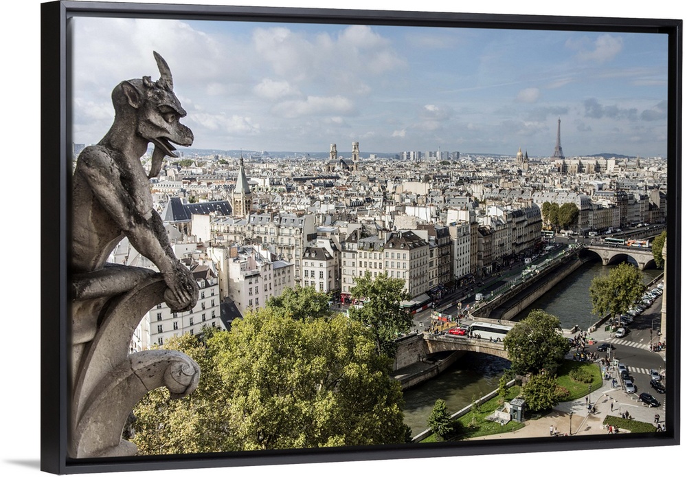 <p>Photograph of a gargoyle statue watching over the city of Paris.</p>