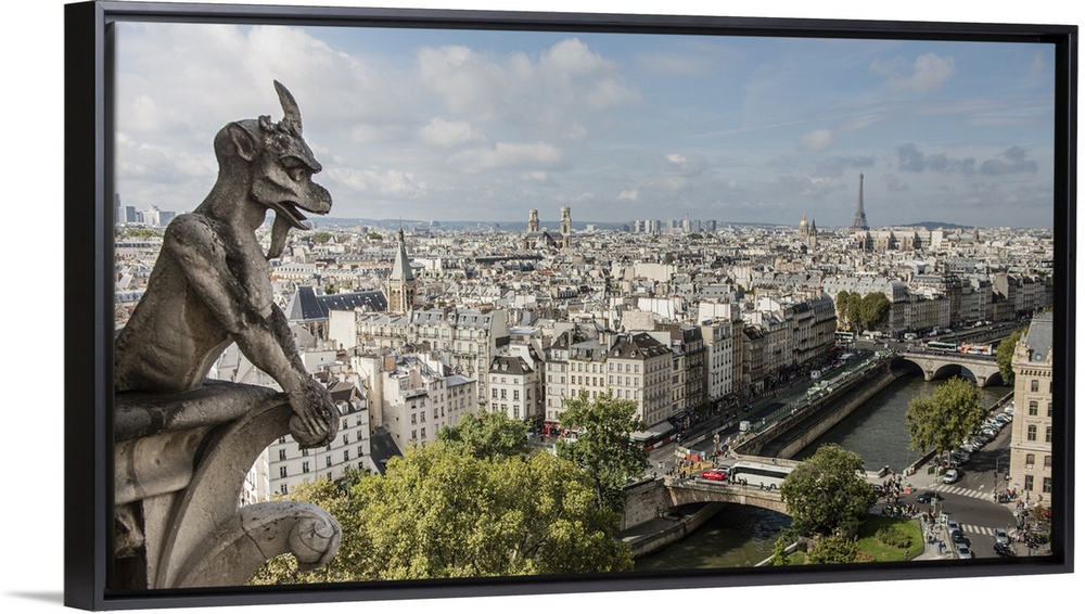 <p>Photograph of a gargoyle statue watching over the city of Paris.</p>