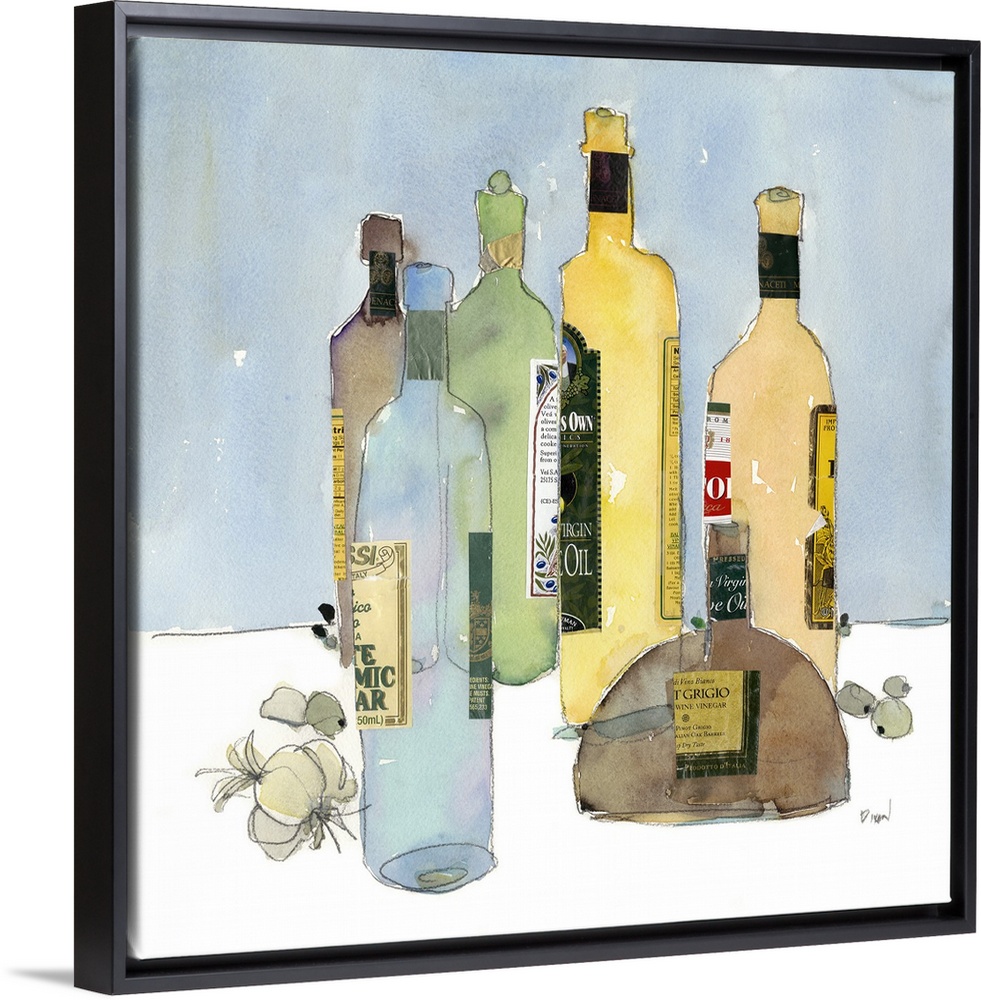<p>Decorative kitchen artwork with bottles of different cooking oils and garlic and olives on the table below.</p>