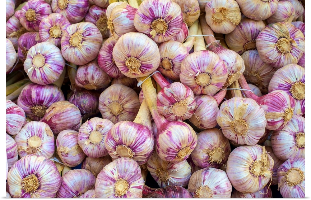 <p>Garlic bulbs for sale at weekly farmer's market on Place de la Liberte, Sarlat-la-Caneda, Dordogne Department, Aquitaine, France.</p>