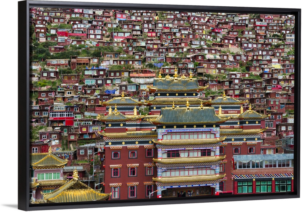 <p>Seda Larung Wuming, the world's largest Tibetan Buddhist institute, temple with red log cabins lived by monks and nuns covering the mountain side, Garze, Sichuan Province, China</p>