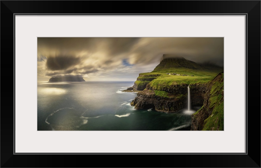 <p>Panorama of Gasadalur village and cloudy Mykines island in sunset, Faroe Islands</p>