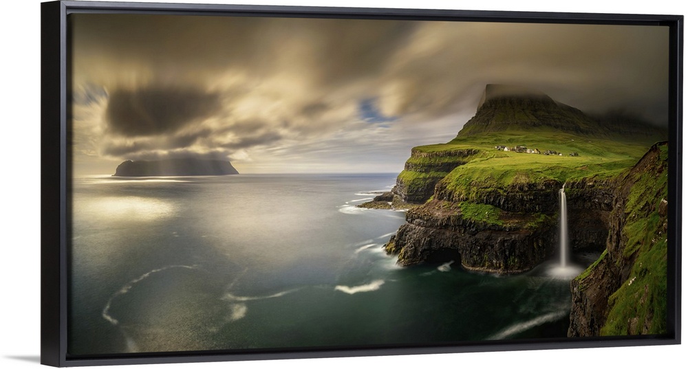 <p>Panorama of Gasadalur village and cloudy Mykines island in sunset, Faroe Islands</p>