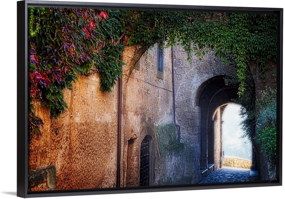 <p>Leafy vines hanging over a stone archway in an old alleyway in Viterbo, Italy.</p>