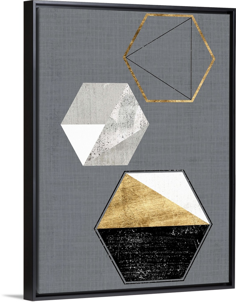 <p>Abstract geometric artwork of triangular and hexagonal shapes in grey and gold.</p>