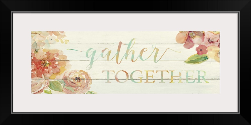<p>"Gather Togther" written on a faux wood panel background with painted pink flowers on the sides.</p>