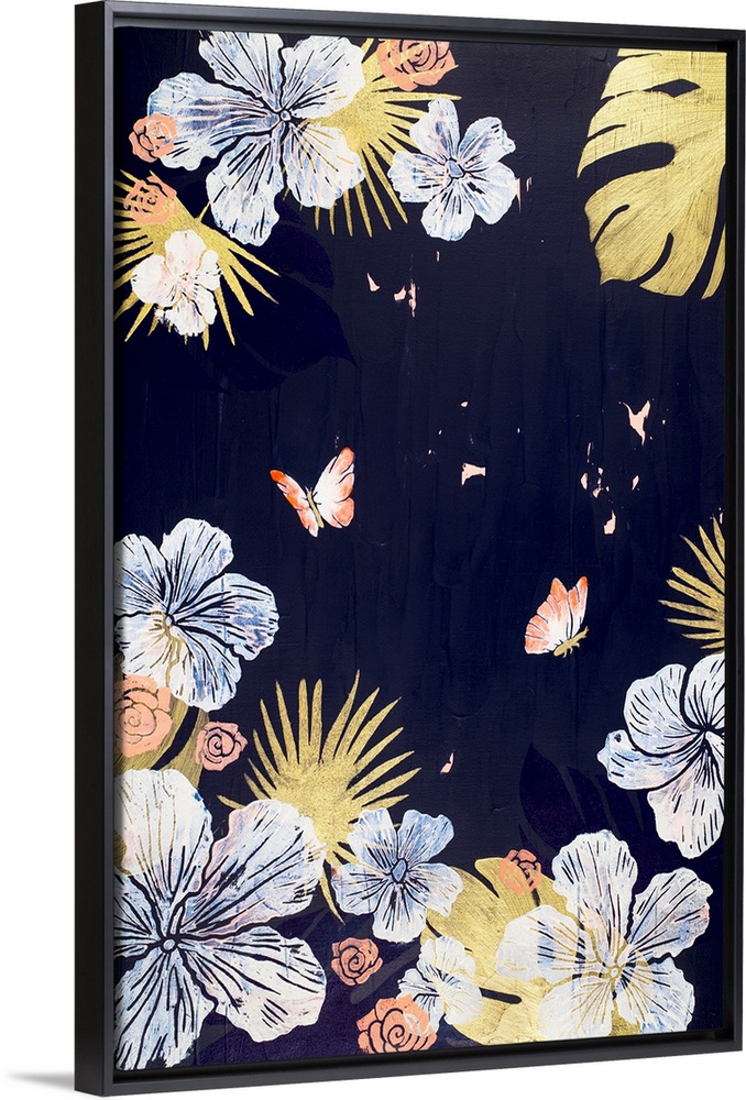 <p>Painting of two tangerine butterflies in garden of hibiscus with navy background.</p>