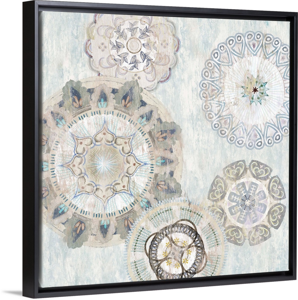 <p>Bohemian motif with several mandala designs in grey and tan.</p>