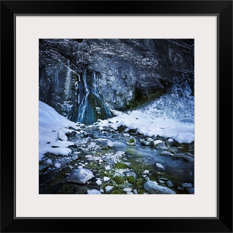<p>Gegskiy waterfall in the snowy mountains of Ritsa Nature Reserve, Abkhazia, Georgia.</p>