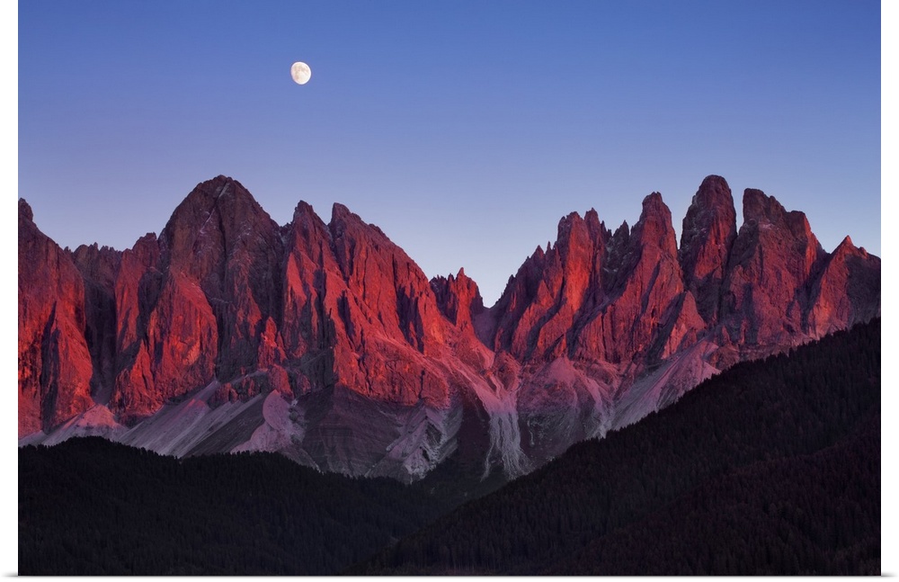 <p>Geisler Peaks with full moon. Italy, Trentino-Alto Adige, South Tyrol, Puez-Geisler Nature Park, St. Magdalena. Alps, Dolomites, Alto Adige, Parco Naturale Puez-Odle, Gruppo delle Odle. Trentino Alto Adige, Western Europe, Italy.</p>