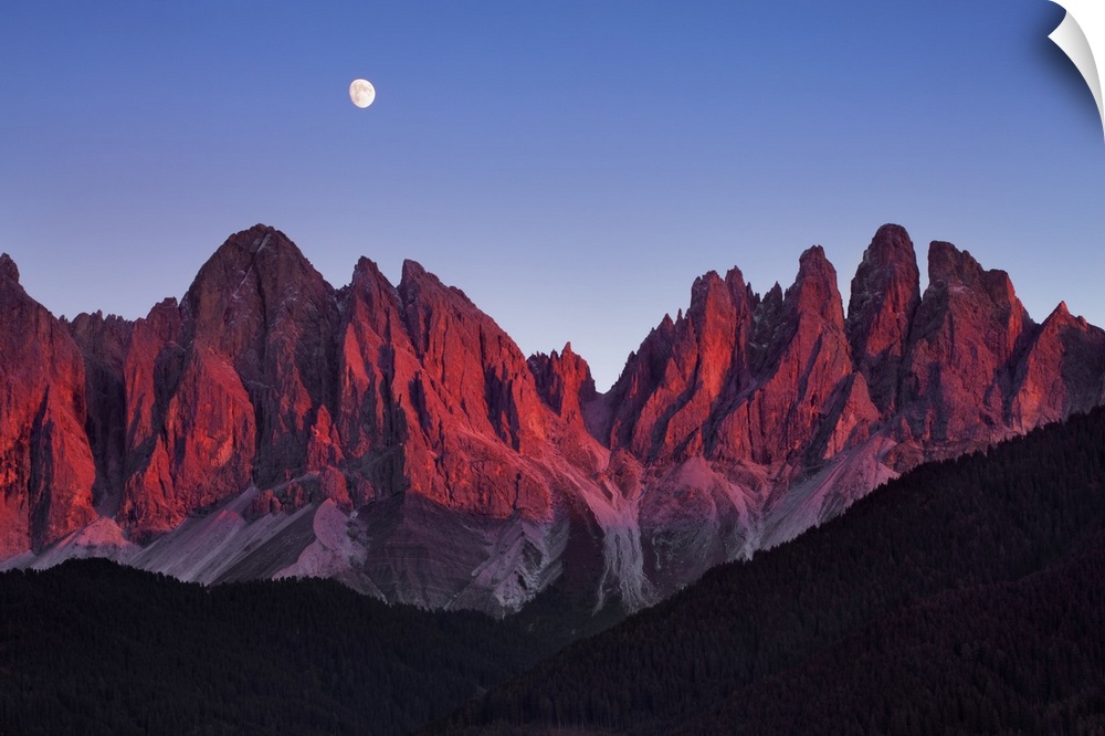 <p>Geisler Peaks with full moon. Italy, Trentino-Alto Adige, South Tyrol, Puez-Geisler Nature Park, St. Magdalena. Alps, Dolomites, Alto Adige, Parco Naturale Puez-Odle, Gruppo delle Odle. Trentino Alto Adige, Western Europe, Italy.</p>