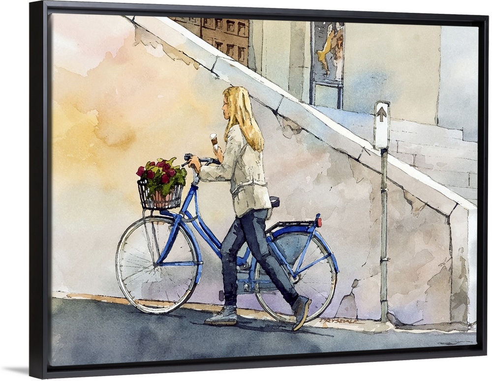 <p>Contemporary watercolor painting of a girl pushing her bicycle with a basket of flowers on it down the road in Lucca, Italy.</p>