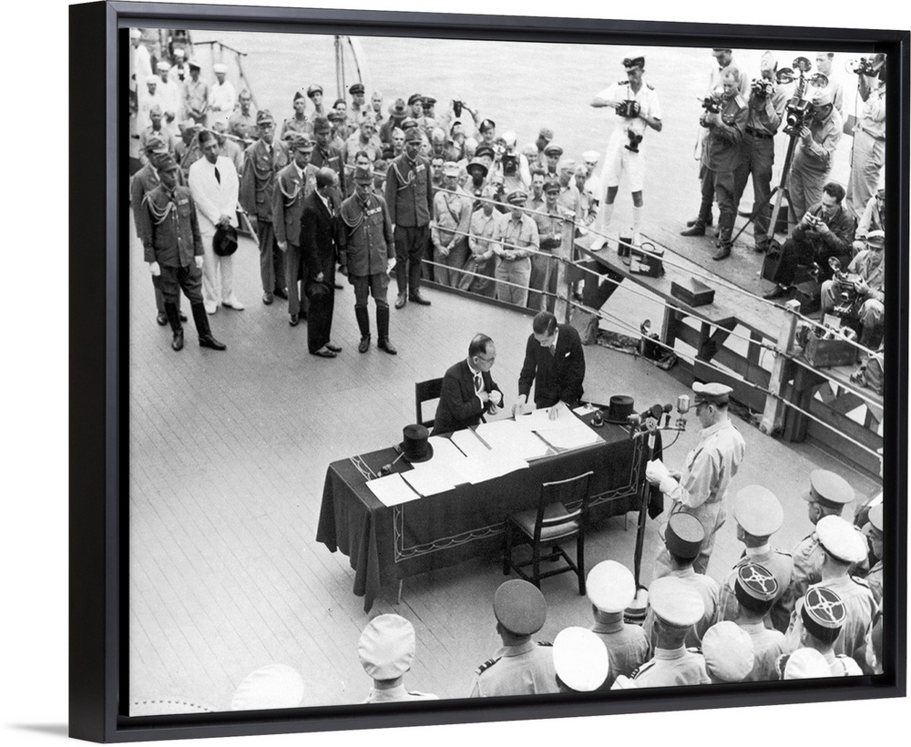 <p>General Douglas MacArthur pauses at the microphone as Japanese Foreign Minister Mamoru Shigemitsu reaches for his pen to sign the surrender of Japan, on board the U.S.S. Missouri in Tokyo Bay, 2 September 1945.</p>