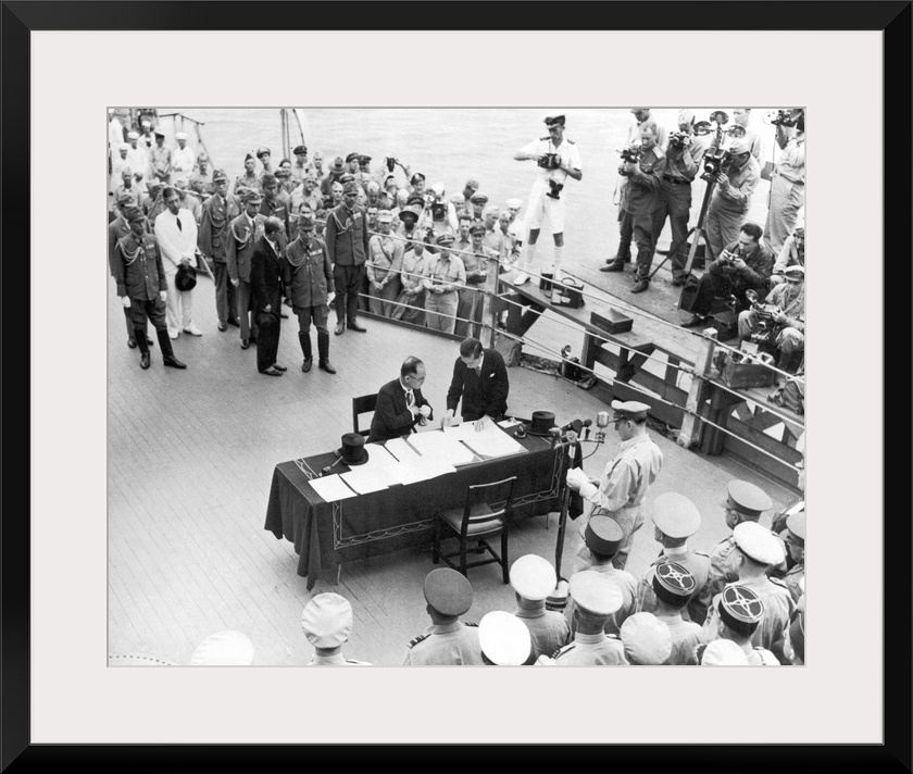 <p>General Douglas MacArthur pauses at the microphone as Japanese Foreign Minister Mamoru Shigemitsu reaches for his pen to sign the surrender of Japan, on board the U.S.S. Missouri in Tokyo Bay, 2 September 1945.</p>