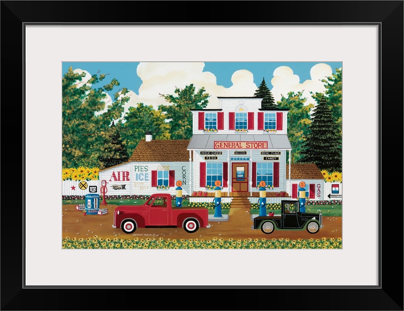 <p>Contemporary Americana painting of a red pick-up truck parked outside of a country general store.</p>