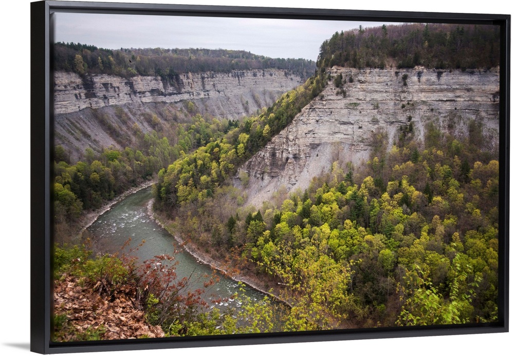<p>Landscape photograph of the Genesee River bending around large rock formations at Letchworth State Park in New York.</p>