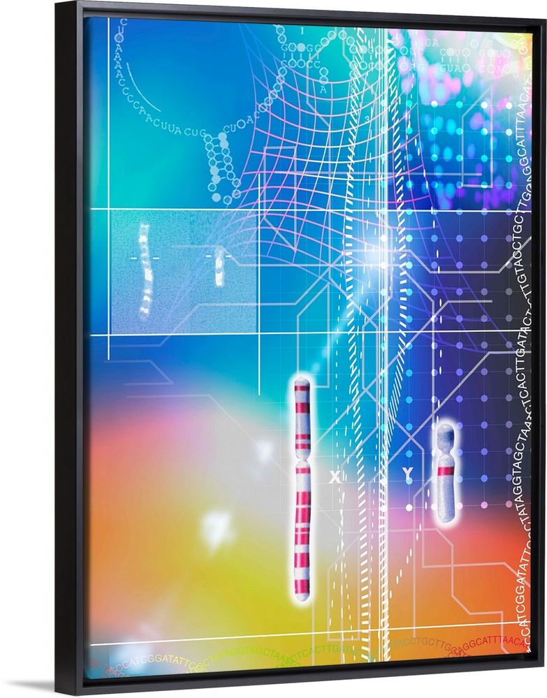 <p>Genetic research, conceptual computer artwork. The X (left) and Y (right) chromosomes (red/white) are the sex chromosomes. Men have an XY chromosome combination, while women have the XX combination. Banding patterns identify the 23 chromosome pairs. Chromosomes, found in cell nuclei, contain DNA (deoxyribonucleic acid). DNA is a helical molecule that is shown down the right edge and along the bottom edge as two twisting strands of letters. The four letters are used to represent the four nucleotide bases of DNA: A (adenine), G (guanine), C (cytosine) and T (thymine). This base sequence varies, making up a unique genetic code. Part of a ribonucleic (RNA) molecule is at top left.</p>
