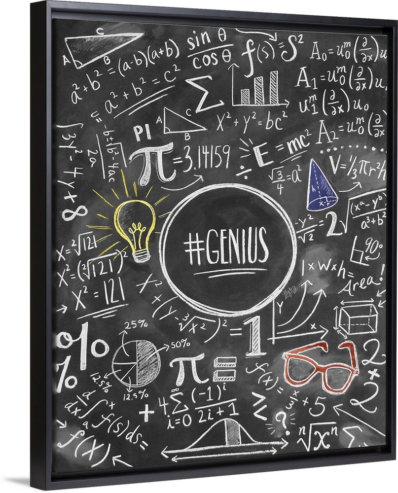 <p>"Genius" surrounded by formulas and equations, handwritten in white chalk.</p>