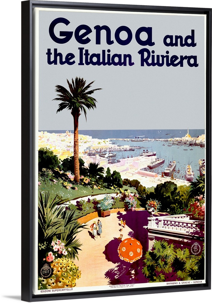 <p>Old advertising print for foreign travel. There is the image of a beach leading to a port that is filled with boats under a clear sky.</p>