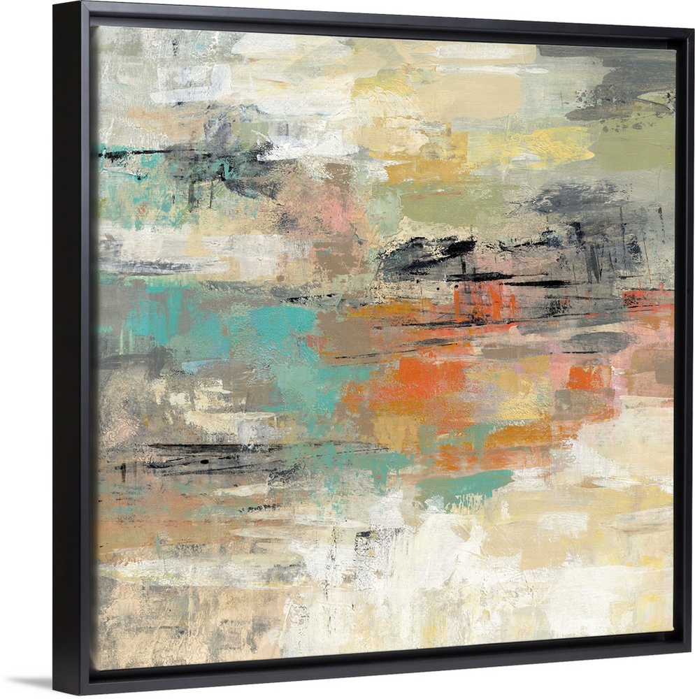 <p>Contemporary abstract artwork in neutral colors with a teal and orange center.</p>