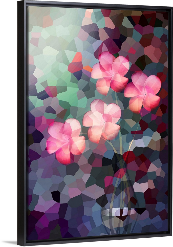 <p>Four pink flowers in a clear glass vase with a geometric stained glass effect.</p>