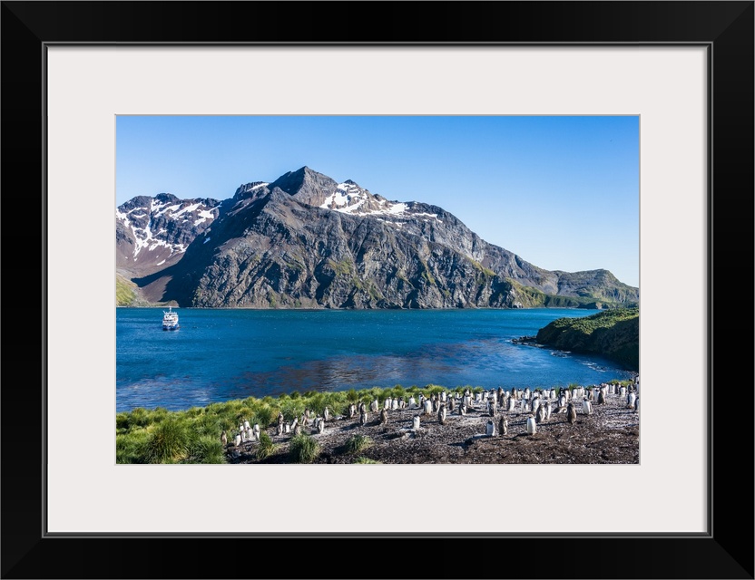 <p>Gentoo penguin colony on the edge of the bay of Godthul, South Georgia, Antarctica, Polar Regions</p>