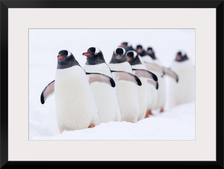 <p>Gentoo Penguin (Pygoscelis papua) group walking through snow, Cuverville Island, Antarctic Peninsula, Antarctica.</p>