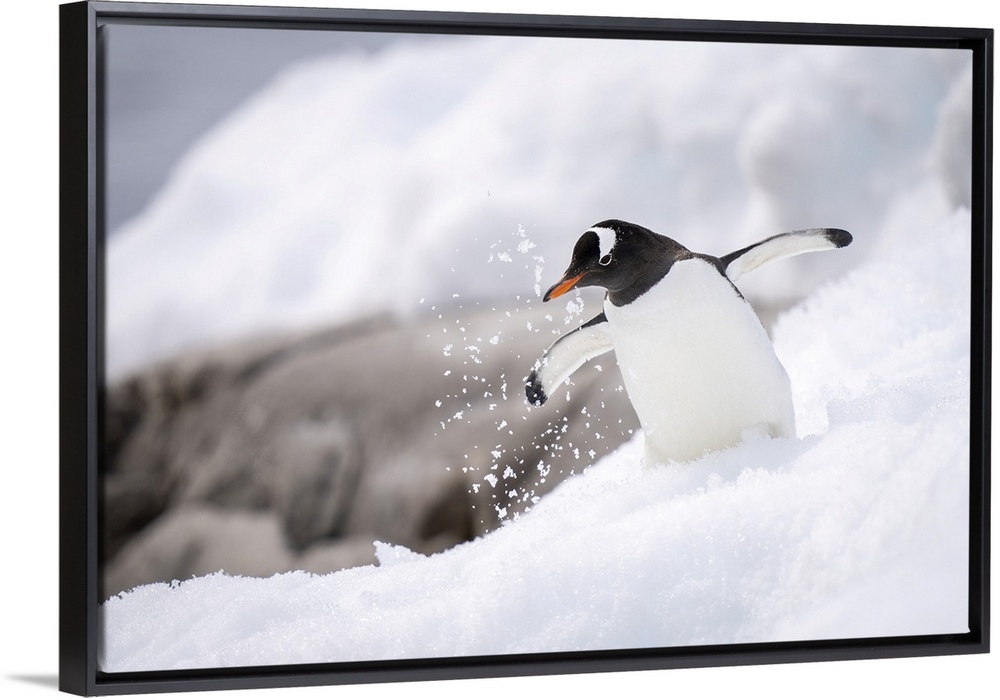 <p>Gentoo penguin (pygoscelis papua) overbalances in snow near rocks, antarctica.</p>
