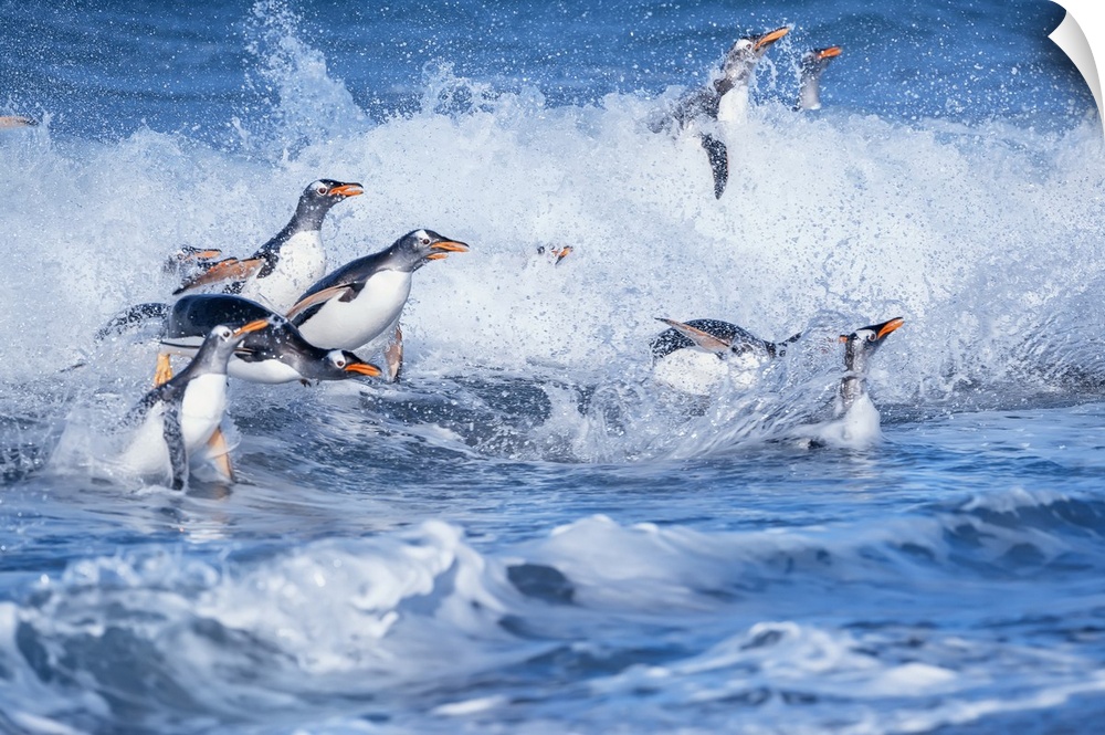 <p>Gentoo penguins (Pygocelis papua papua) jumping out of the water, Sea Lion Island, Falkland Islands, South America</p>