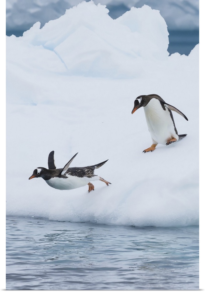 <p>Gentoo Penguins dive off an Iceberg on Cuverville Island in the Gerlach Strait, Antarctica.</p>