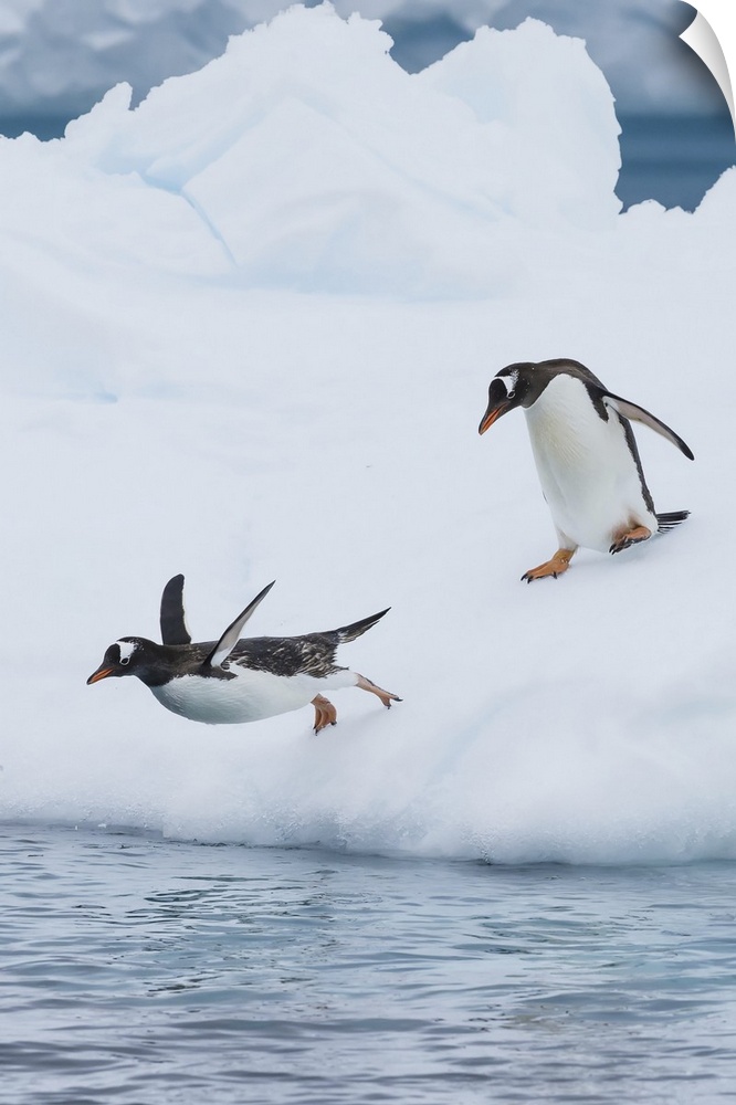 <p>Gentoo Penguins dive off an Iceberg on Cuverville Island in the Gerlach Strait, Antarctica.</p>
