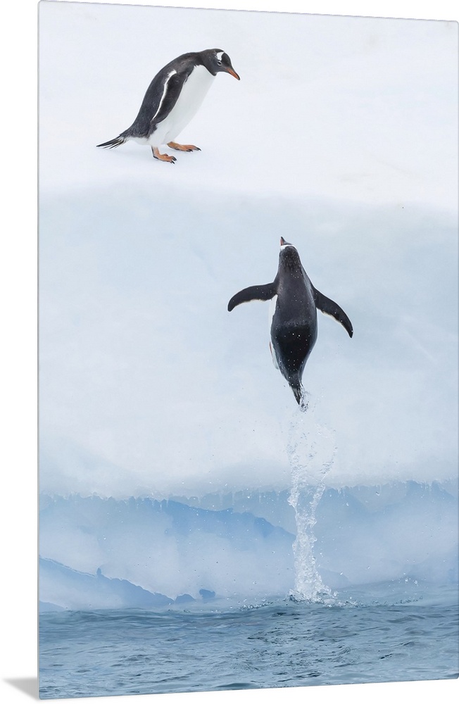 <p>Gentoo Penguins jump onto an Iceberg on Cuverville Island in the Gerlach Strait, Antarctica.</p>
