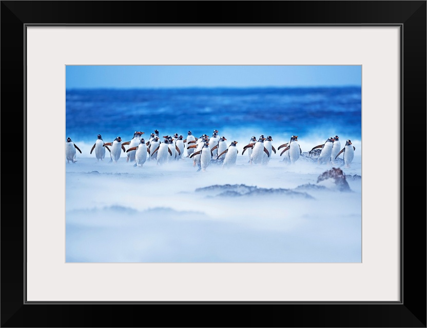 <p>Gentoo Penguins (Pygocelis papua papua) walking through a sandstorm, Sea Lion Island, Falkland Islands.</p>