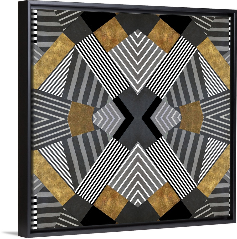 <p>Square abstract painting with four boxes filled with the same geometric patterns of striped lines, rectangles, and squares, forming together to create a symmetrical piece.</p>
