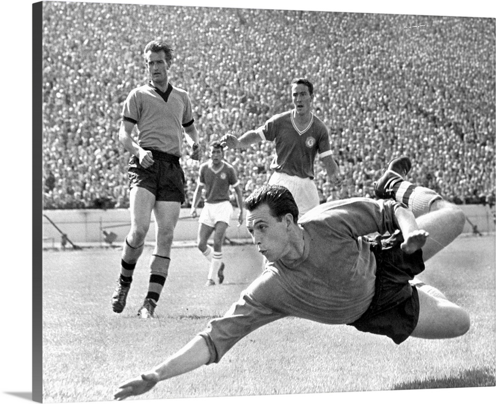 <p>27th August 1960: Geoff Sidebottom, goalkeeper for Wolverhampton Wanderers, in action during a league match against Chelsea Jimmy Greaves of Chelsea looks on</p>