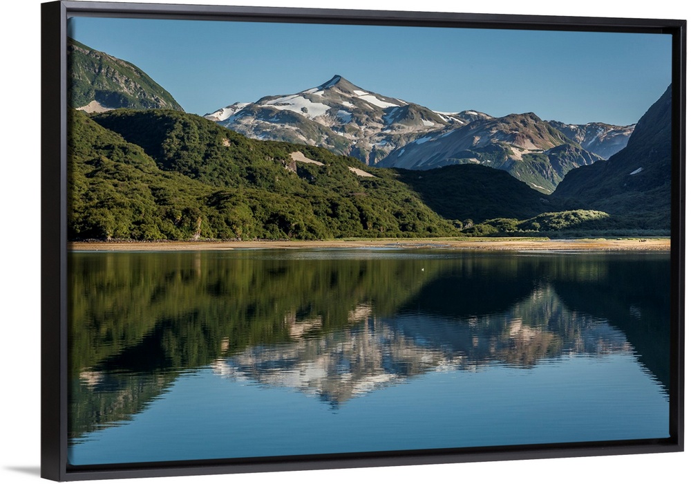 <p>North America, USA, Alaska, Katmai National Park. Scenic landscape in Geographic Harbor of Amalik Bay showing mountains with snow fields and the river delta.</p>