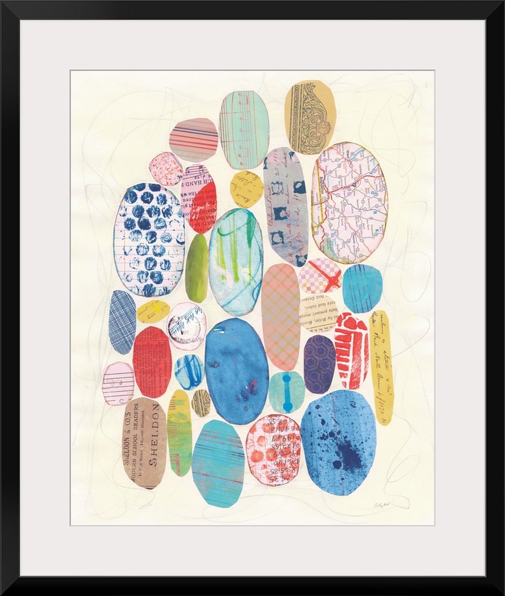 <p>Mixed media artwork with cut out oblong shapes placed together in the middle of a white background with light, thin, squiggly lines all around.</p>