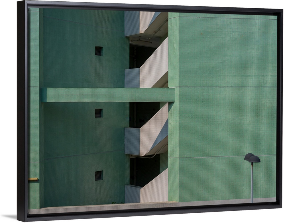 <p>Photograph of a pale green and white building facade with covered staircases creating geometrical shapes and movement.</p>