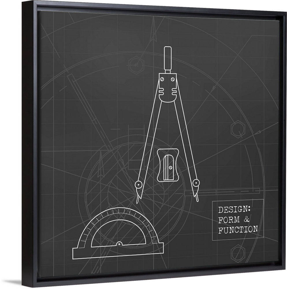 <p>Illustration of a compass, pencil sharpener, and a protractor in a black and white blueprint style with "Design: Form and Function" written in the bottom corner.</p>
