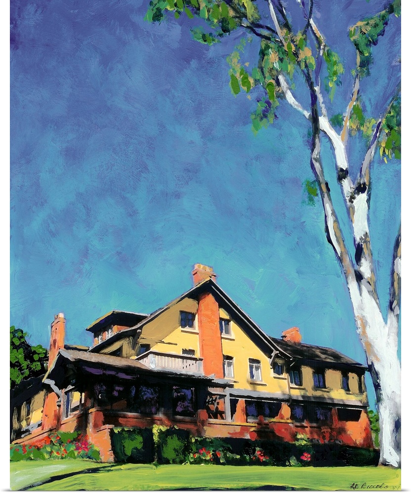 <p>George Marston House with the giant eucalyptus tree, painting by San Diego artist RD Riccoboni. The Marston House Museum is one of San Diego's finest examples of the Arts and Crafts movement and was constructed in 1905 for George W. Marston and his wife, Anna Gunn Marston. George Marston is noted for many things but most prominently as a civic leader whose interest and work in historic preservation, conservation and history is renowned. A National Historic Landmark, George Marston House and its spectacular gardens are operated by SOHO, Save Our Heritage Organisation, and open to the public.</p>