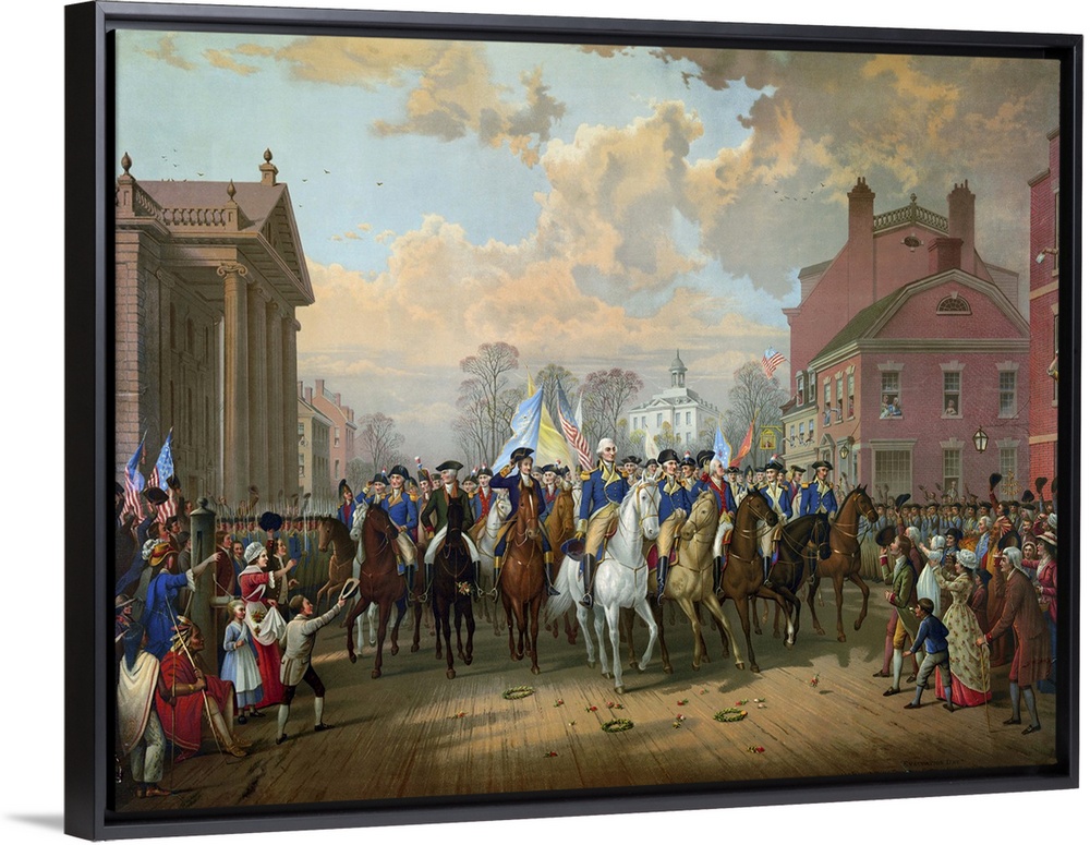 <p>George Washington's triumphant entry into New York City on 25 November 1783, after the evacuation of the city by the British. Lithograph, American, 1879, by Edmund P. and Ludwig Restein.</p>