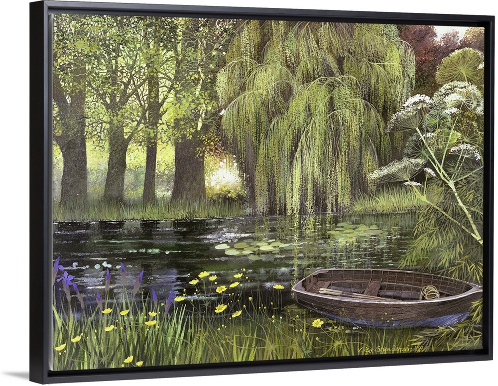 <p>Contemporary painting of a row boat on the edge of a countryside pond.</p>