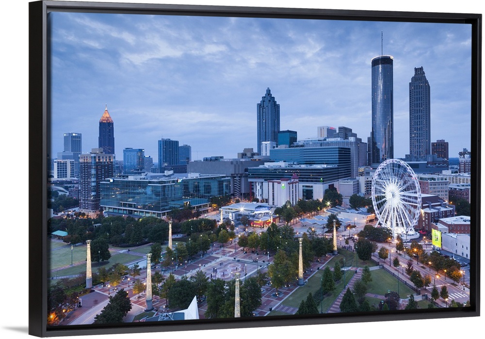 <p>Georgia, Atlanta, Centennial Olympic Park, elevated city view with Ferris wheel, dusk.</p>