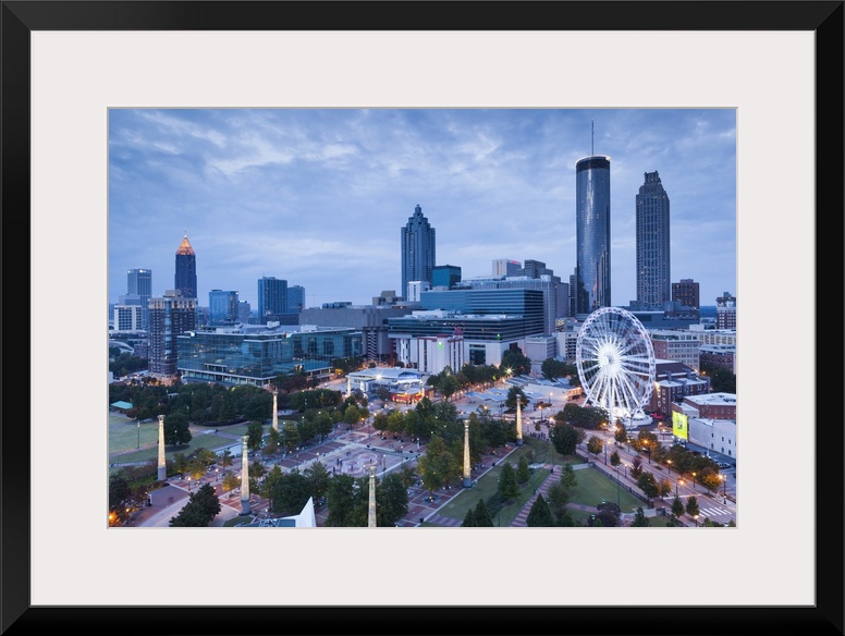 <p>Georgia, Atlanta, Centennial Olympic Park, elevated city view with Ferris wheel, dusk.</p>