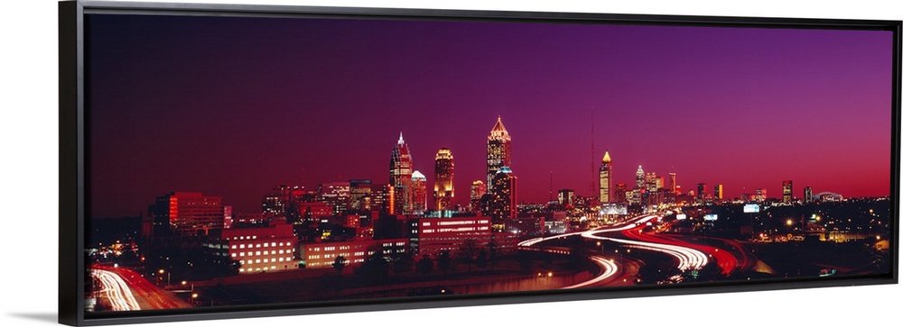 <p>Panoramic photograph displays the busy streets of a famous city in the Southeastern United States as the skyscrapers brighten the nighttime sky. Photographer uses a slow shutter speed to get the effect of fast moving traffic running through the image.</p>