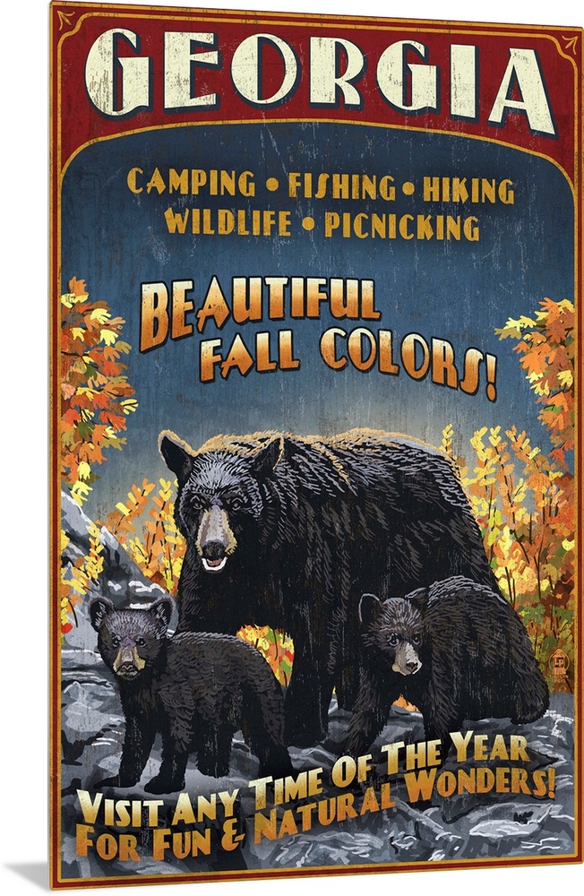<p>Retro stylized art poster of a black bear mother with her two cubs in the wild.</p>