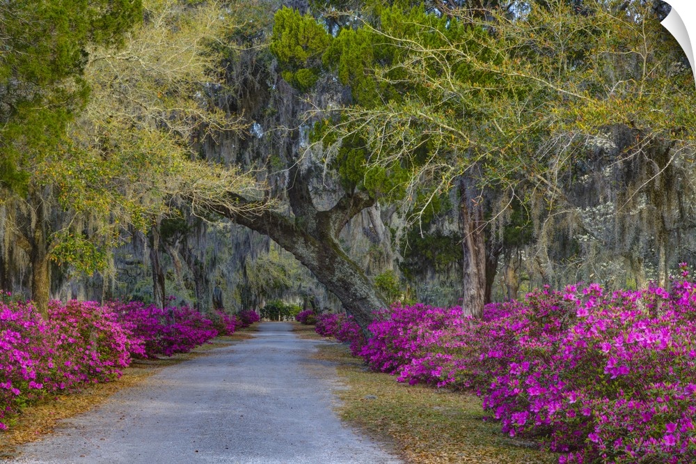 <p>North America, USA, Georgia, Savannah, Azaleas along drive in Historic Bonaventure Cemetery.</p>
